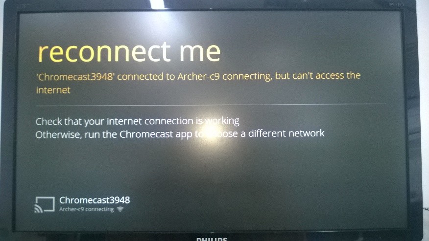 Esto se debe a que Chromecast no puede conectarse al servidor de Google, asegúrese de poder acceder a www.google.com en otros dispositivos (así como en esta computadora) que también están conectados a la misma red inalámbrica.