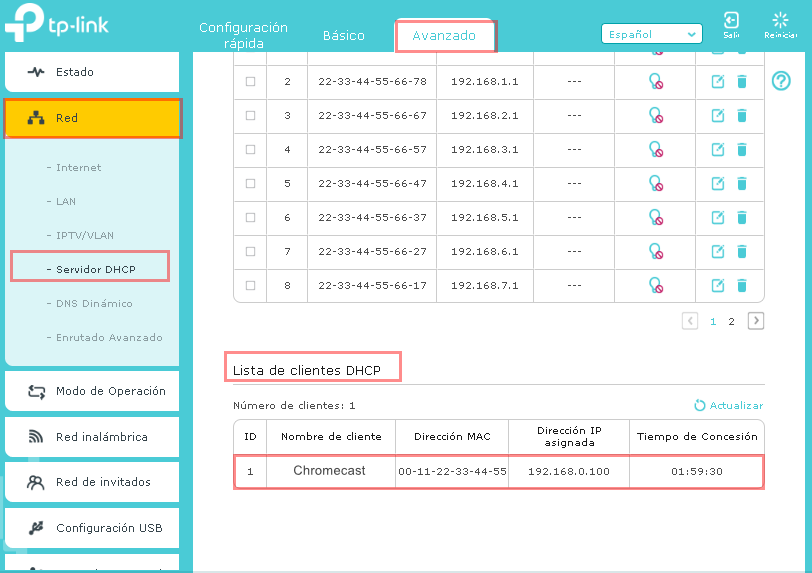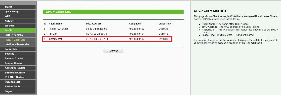 - Vaya a la lista de clientes DHCP para verificar si Chromecast se muestra en esa lista y asegúrese de que tenga una dirección IP, luego recuerde la dirección MAC de Chromecast;