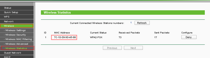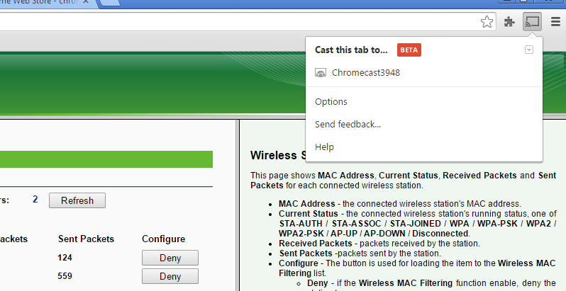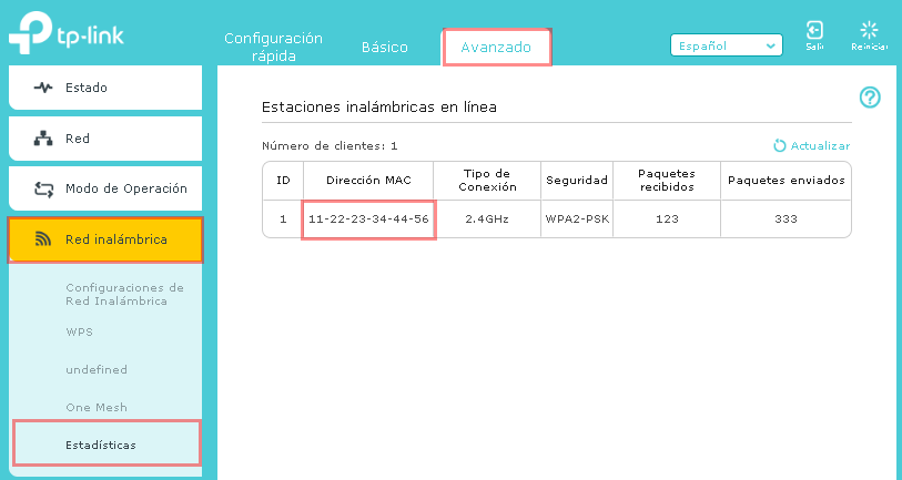 3. Vaya a Wireless/Inalambrico->Wireless Statistics Estadisticas inalambricas y verifique si Chromecast (basado en la dirección MAC) se ha asociado con el módem/router;