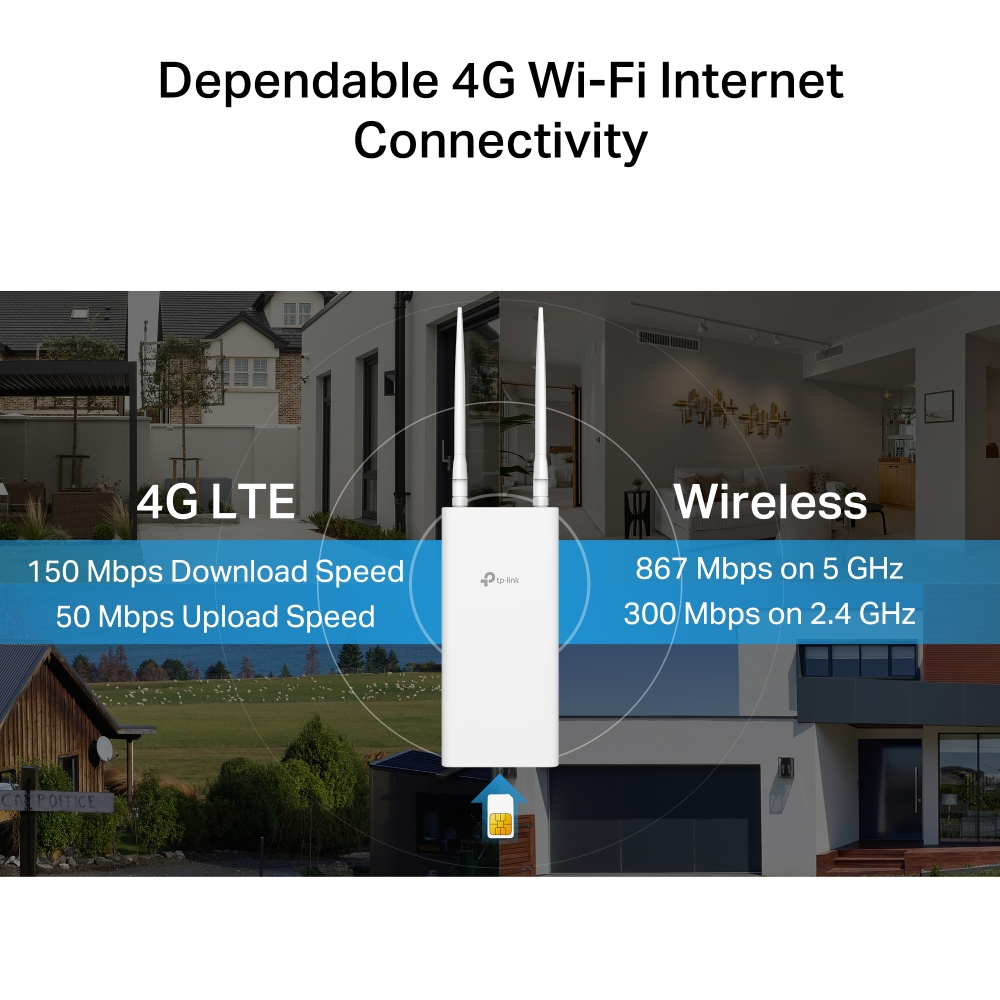 The Archer MR402-Outdoor supports 4G LTE for internet download speeds up to 150 Mbps, paired with dual-band Wi-Fi speeds of up to 867 Mbps on 5 GHz and 300 Mbps on 2.4 GHz, enabling seamless networking experience. Simply insert your SIM card to enjoy reliable internet indoors and outdoors. *◇
