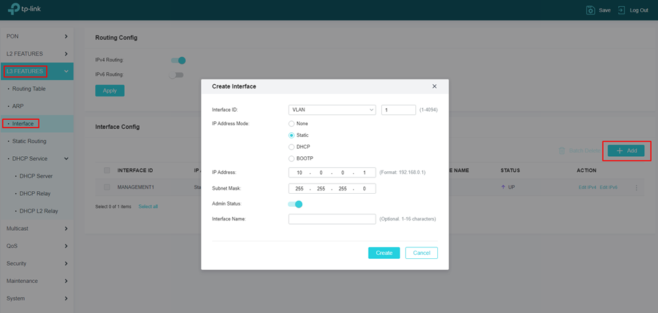Siga o caminho L3 Features > Interface > Add.