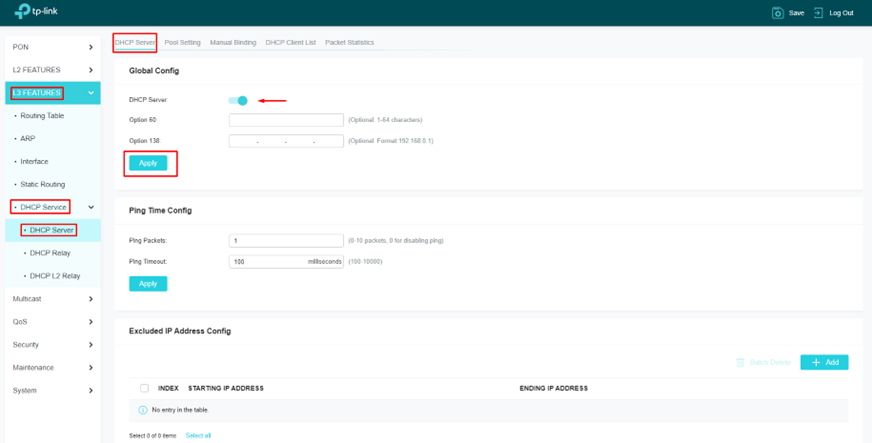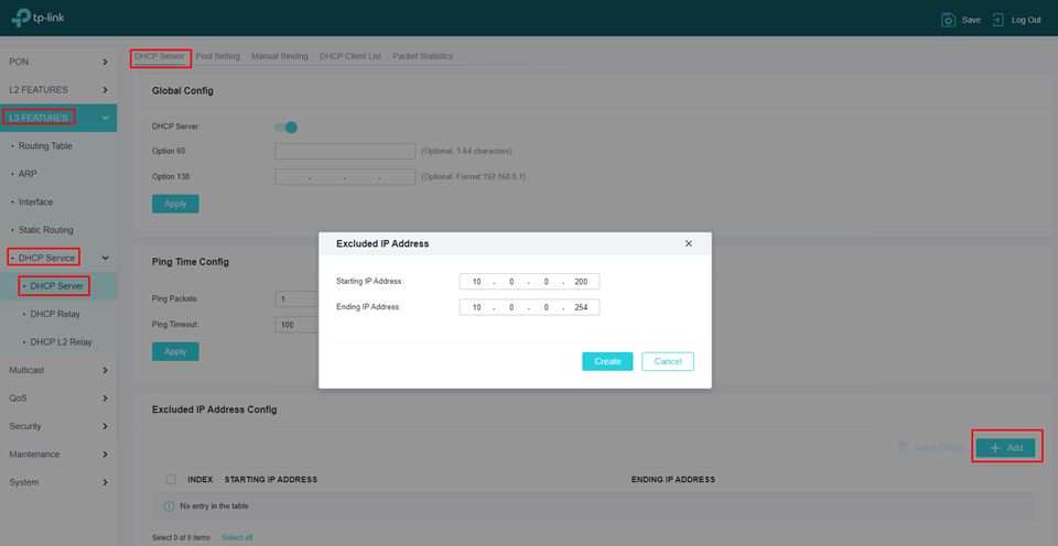 Para excluir algum endereço da pool basta navegar até L3 Features > DHCP Service > DHCP Server > List > Excluded IP Address Config > Add
