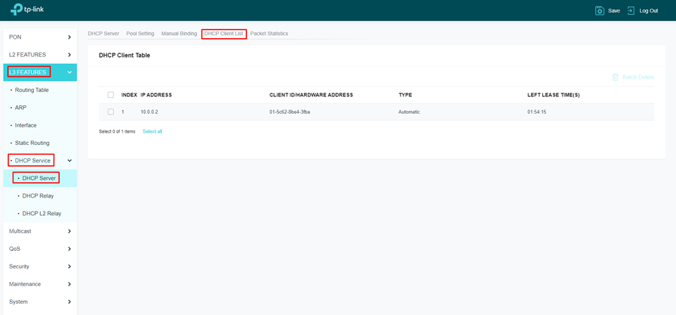 Após realizar todas as configurações e provisionar as ONTS em modo DHCP, basta confirmar as IPs utilizados navengando até L3 Features > DHCP Service > DHCP Server > DHCP Client