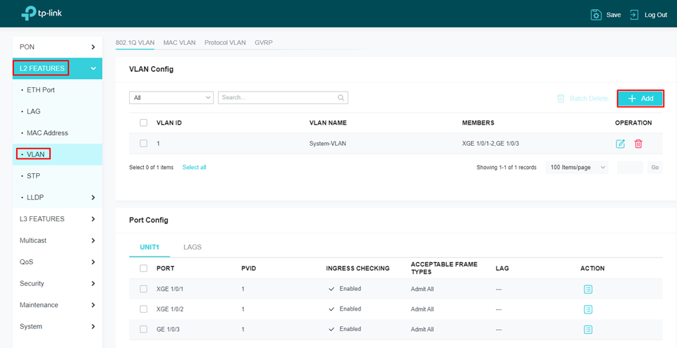Para criar suas VLANs, navegue até L2 Features > VLAN > Add