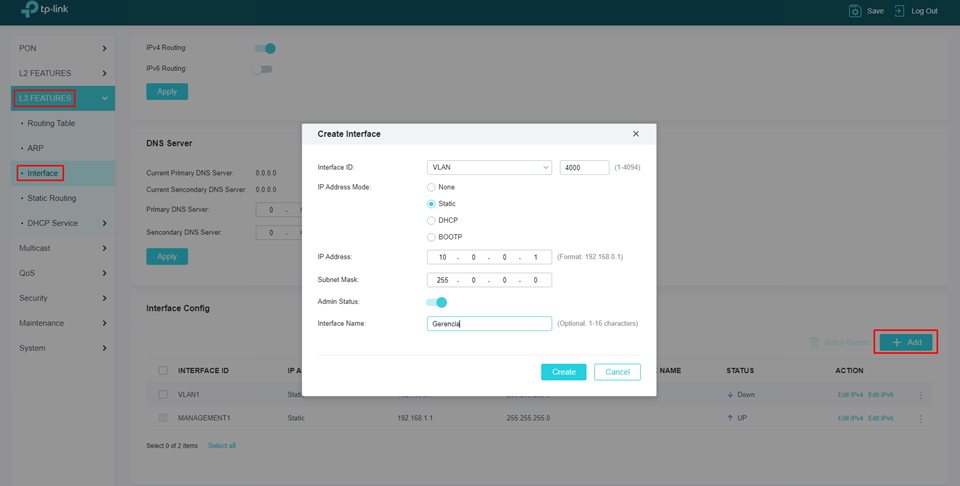 Para criar a VLAN de Gerência, repita o procedimento anterior, incluindo a VLAN desejada como VLAN de Gerência. Após criar a VLAN, vá para L3 Features > Interface > Interface Config > Add.