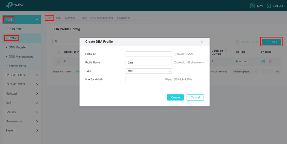 Para adicionar TCont ID, basta clicar no botão de “Add” e informar T-CONT ID, sendo que o primeir ID disponivel é o 1, e selecionar o DBA Profile, neste exemplo iremos selecionar o DBA criado nos passos anteriores.