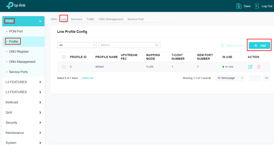 Para criar um perfil de Line, basta navegar até PON>Profile>Line e adicionar um novo perfil clicando no botão “Add”.