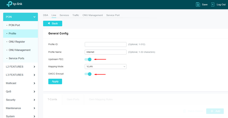 Ao criar um novo perfil Line, insira um nome ao perfil conforme desjado, ative as funções Upstream FEC e OMCC Encrypt. Lembrando que Profile ID e Profile name são de preenchimento opcional, caso não seja preenchido recebera um nome ou numero sequencial.