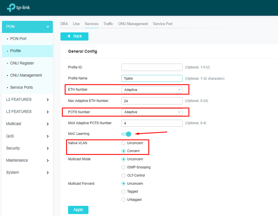 Ao criar um novo perfil de serviço, insira um nome ao perfil conforme desejado, escolha a quantidade de portas ETH, ou se desejar, deixe adaptativo. Escolha tambem a quantidade de portas de telefonia, ou se desejar, deixe adaptativo. Ative a função MAC Learning e opte entre Native VLAN “Unconcerned” ou “Concern”, neste exemplo e de acordo com as configuraçoes anteriores iremos deixar como “concern”.