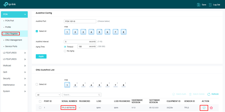Para provisionar um novo equipamento na OLT basta navegar até a aba PON > ONU Register, desça a lista de autofind até encontrar o equipamento que deseja provisionar e clique no botão “Auth”.