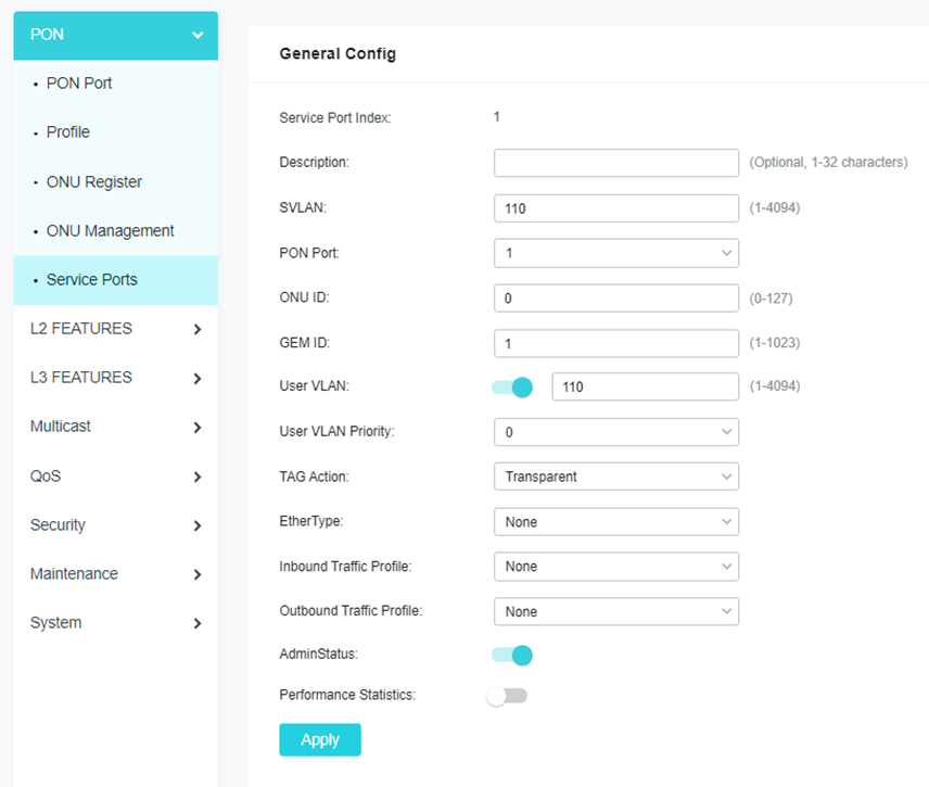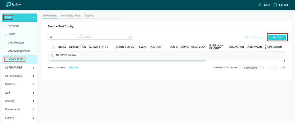 Para adicionar uma service port basta navegar até PON>Service Ports >Add