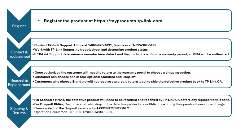 If your product(s) no long qualify under the online/retail store’s replacement policy, you may process it through TP-Link Canada's RMA program by following the steps below.