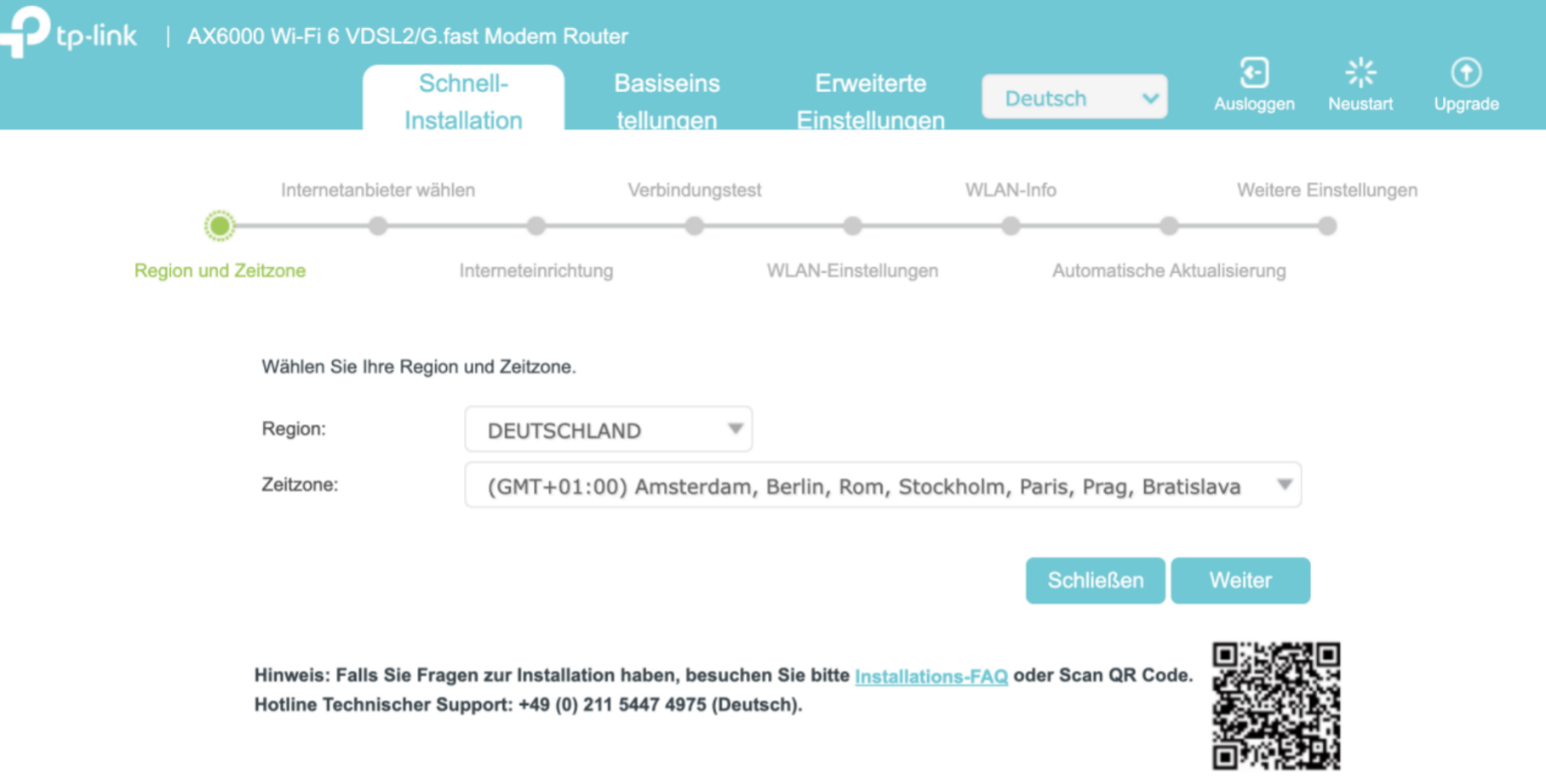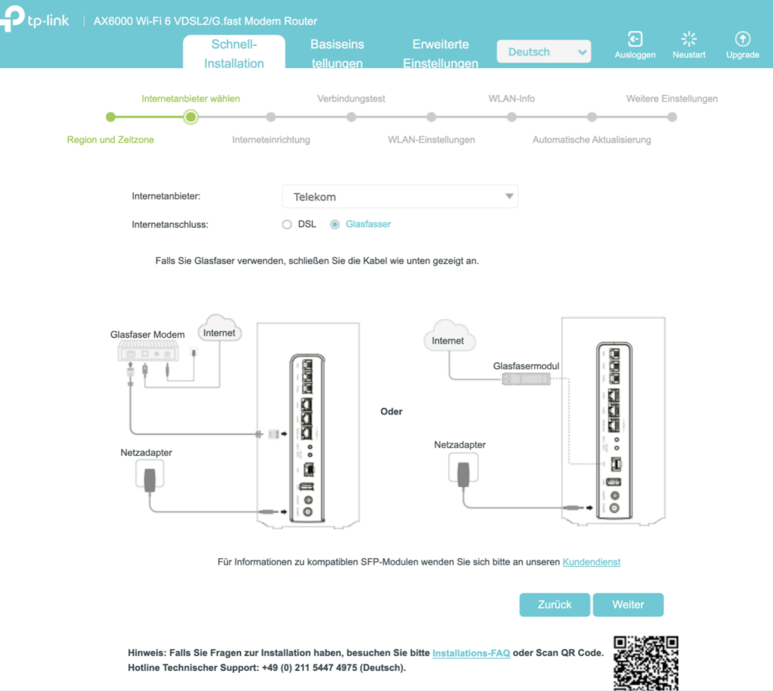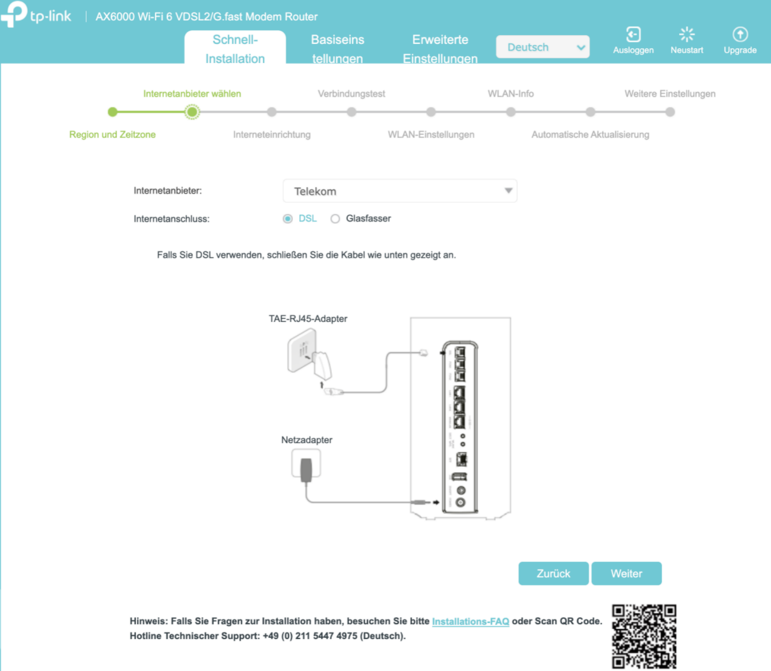 Starten Sie die Schnellinstallation, wählen Sie Region und Zeitzone, wählen Sie Telekom aus der Liste der Internetanbieter und klicken Sie auf Weiter.