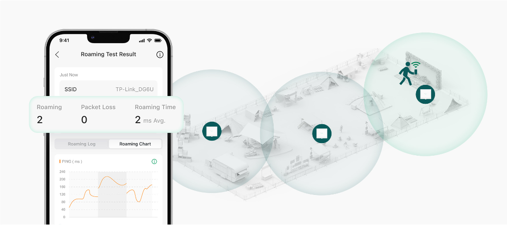 Omada Wi-Fi Navi features a built-in Roaming Test to assess how quickly and reliably devices switch between access points. It captures key metrics like packet loss, latency, and negotiation speed, helping you fine-tune roaming performance in environments with frequent user movement, such as offices and campuses.