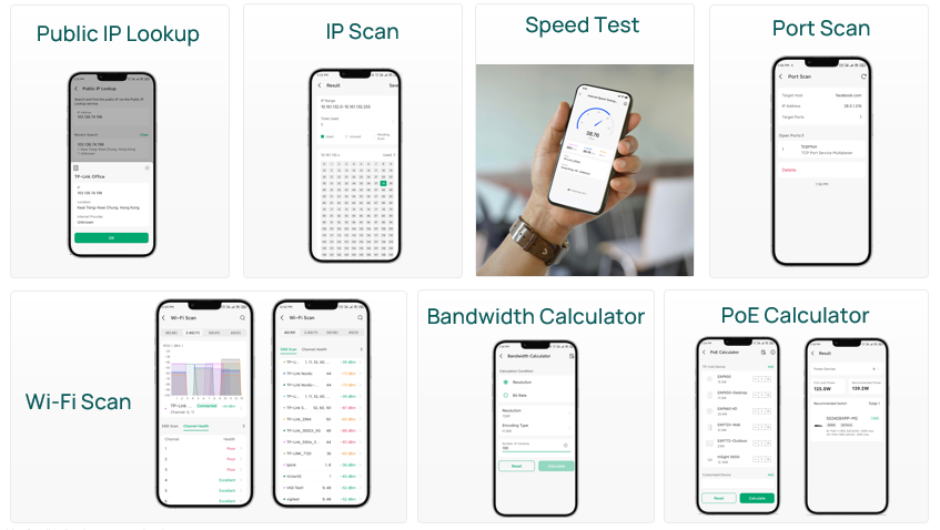 In addition to its advanced features, Omada Wi-Fi Navi also equips you with handy network utilities like Public IP Lookup, IP Scanner, Port Scanner, and Bandwidth & PoE Calculators. Perfect for quick diagnostics, planning, and on-site device discovery.