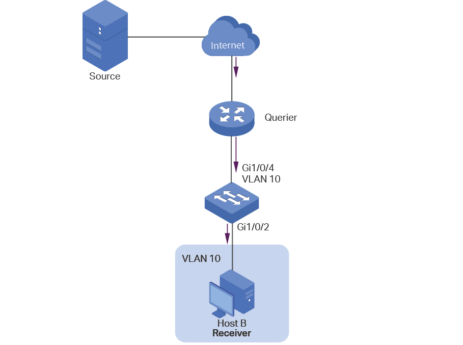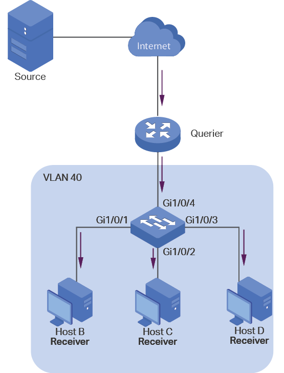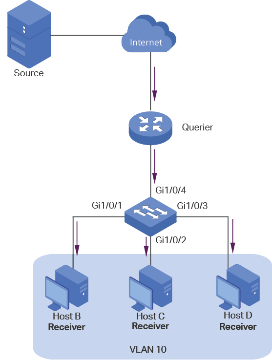 A snooping switch indicates a switch with IGMP Snooping enabled. The switch maintains a multicast forwarding table by snooping on the IGMP transmissions between the host and the querier. With the multicast forwarding table, the switch can forward multicast data only to the ports that are in the corresponding multicast group, so as to constrain the flooding of multicast data in the Layer 2 network.