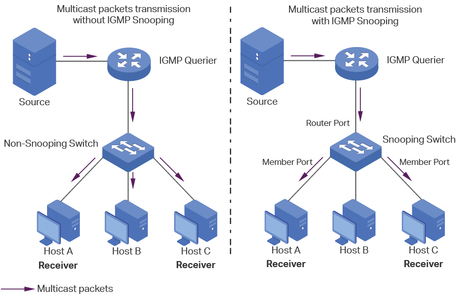 Take IGMP Snooping as an example. When IGMP Snooping is disabled on the Layer 2 device, multicast packets will be broadcast in the Layer 2 network; when IGMP Snooping is enabled on the Layer 2 device, multicast data from a known multicast group will be transmitted to the designated receivers instead of being broadcast in the Layer 2 network.