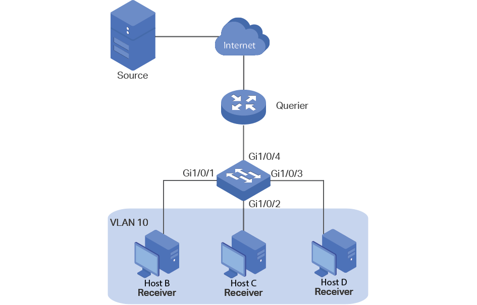As shown in the following network topology, Host B is connected to port 1/0/1, Host C is connected to port 1/0/2 and Host D is connected to port 1/0/3. They are all in VLAN 10.
