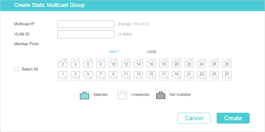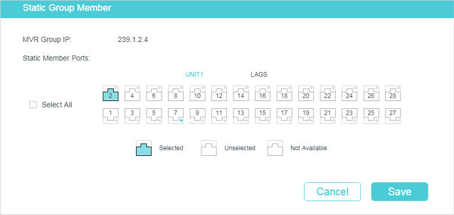 Select one or more ports to be the static router ports in the VLAN. Static router ports do not age. Multicast streams and IGMP packets to all groups in this VLAN will be forwarded through the static router ports. Multicast streams and IGMP packets to the groups that have dynamic router ports will be also forwarded through the corresponding dynamic router ports. |