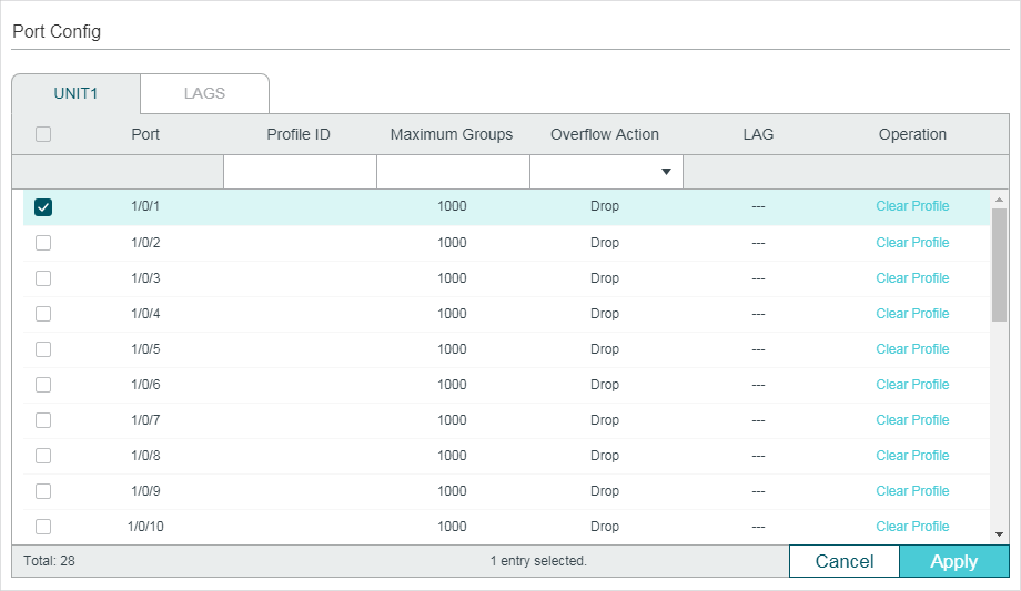 With the functions for managing multicast groups, whitelist and blacklist mechanism (profile binding), the switch can only allow specific member ports to join specific multicast groups or disallow specific member ports to join specific multicast groups. You can achieve this filtering function by creating a profile and binding it to the corresponding member port.