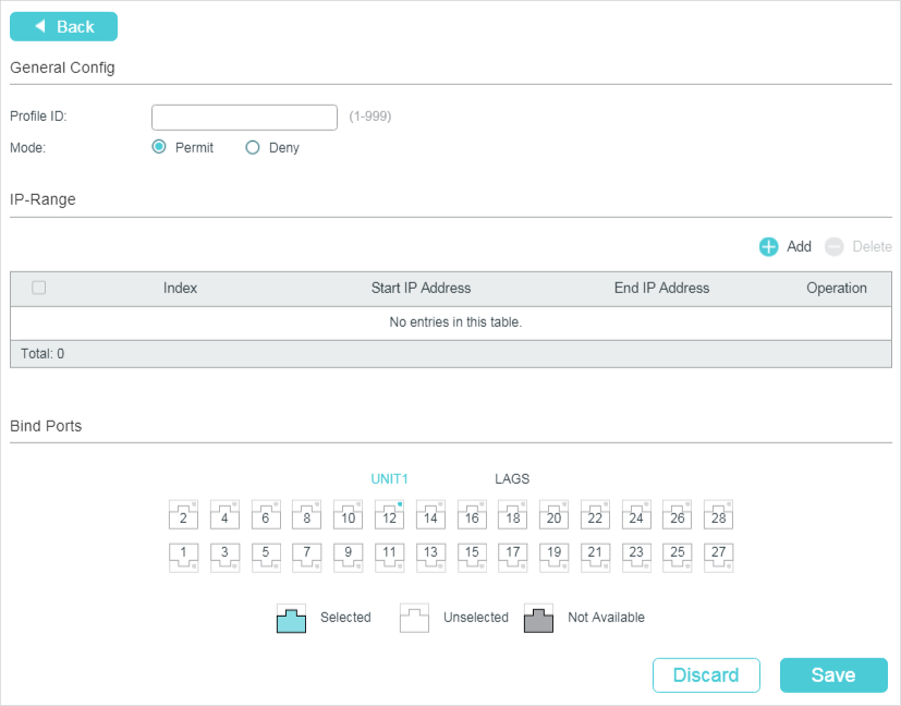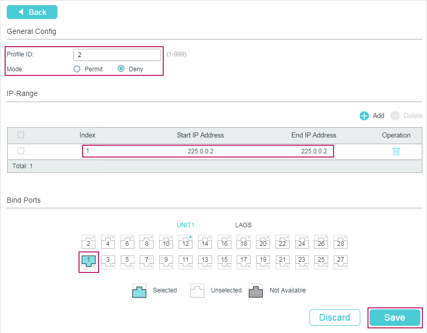 9)Create Profile 2, configure the mode as deny, and add an IP range with both start IP and end IP being 225.0.0.2.