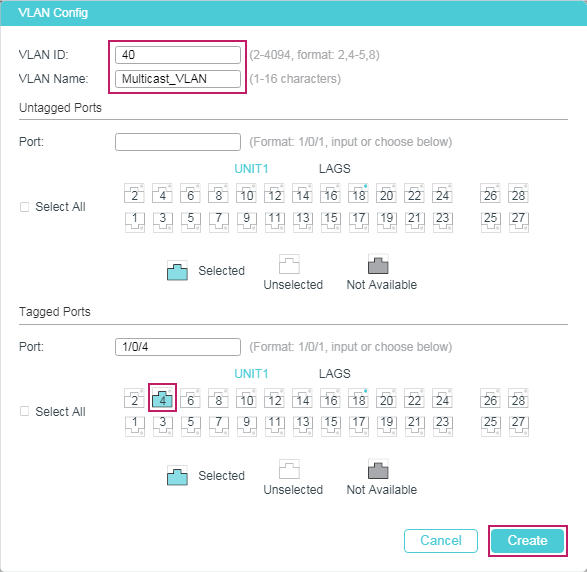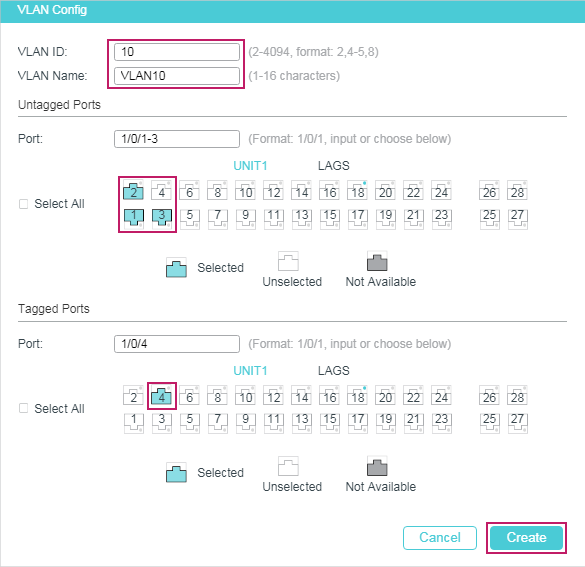 1)Create VLAN 10. Add port 1/0/1-3 to the VLAN as untagged port and port 1/0/4 as tagged port. Configure the PVID of the four ports as 10. For details, refer to Configuring 802.1Q VLAN.