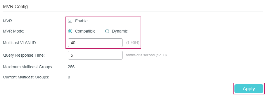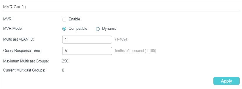 MVR allows a single multicast VLAN to be shared for multicast member ports in different VLANs in IPv4 network. In IGMP Snooping, if member ports are in different VLANs, a copy of the multicast streams is sent to each VLAN that has member ports. While MVR provides a dedicated multicast VLAN to forward multicast traffic over the Layer 2 network, to avoid duplication of multicast streams for clients in different VLANs. Clients can dynamically join or leave the multicast VLAN without interfering with their relationships in other VLANs.