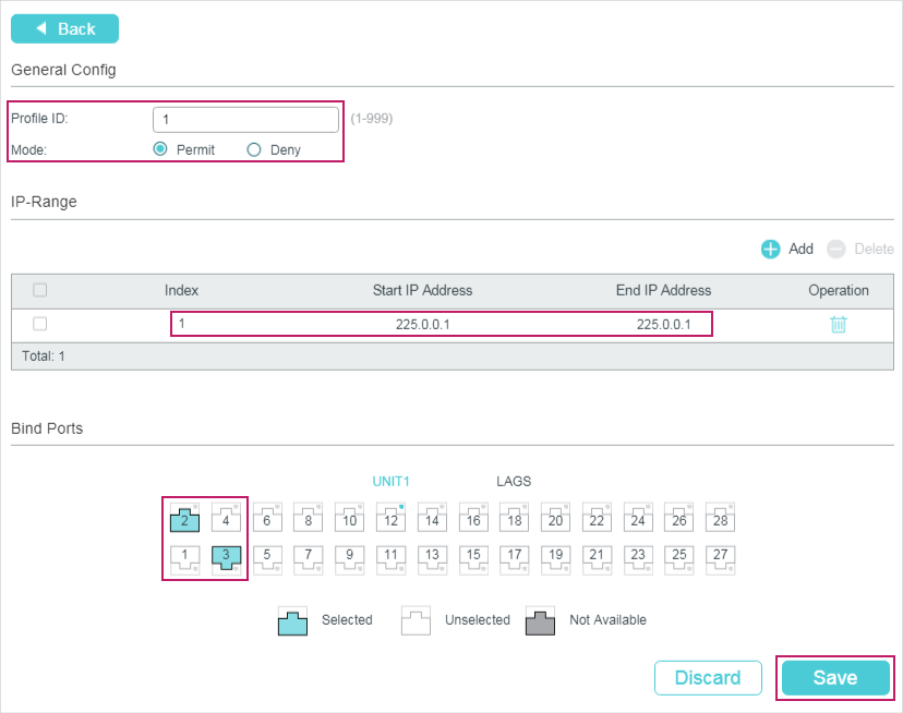 5)Choose the menu L2 FEATURES > Multicast > Multicast Filtering > IPv4 Profile and click to load the following page. Create Profile 1, specify the mode as Permit, bind the profile to port 1/0/2-3, and specify the filtering multicast IP address as 225.0.0.1. Then click Back to return to the IPv4 Profile Table page.