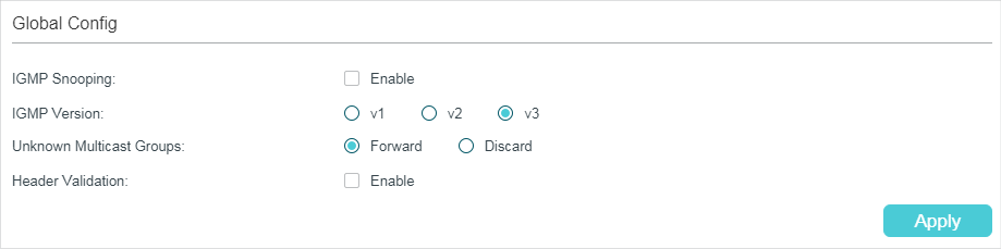 1)In the Global Config section, enable IGMP Snooping globally and configure the global parameters.