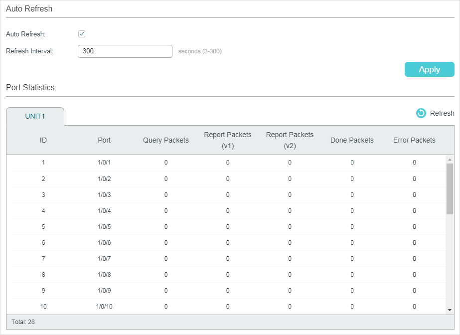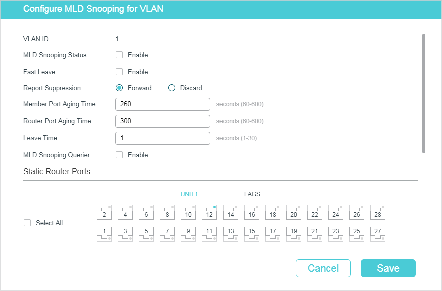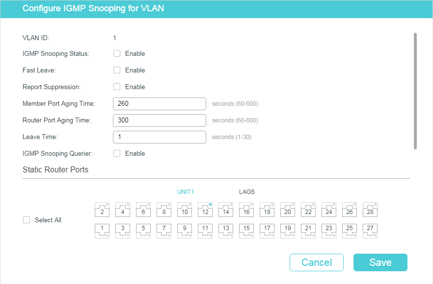 Specify the aging time of the member ports in the VLAN. Once the switch receives an IGMP membership report message from a port, the switch adds this port to the member port list of the corresponding multicast group. Member ports that are learned in this way are called dynamic member ports. If the switch does not receive any IGMP membership report messages for a specific multicast group from a dynamic member port, it will no longer consider this port as a member port of this multicast group and delete it from the multicast forwarding table. |