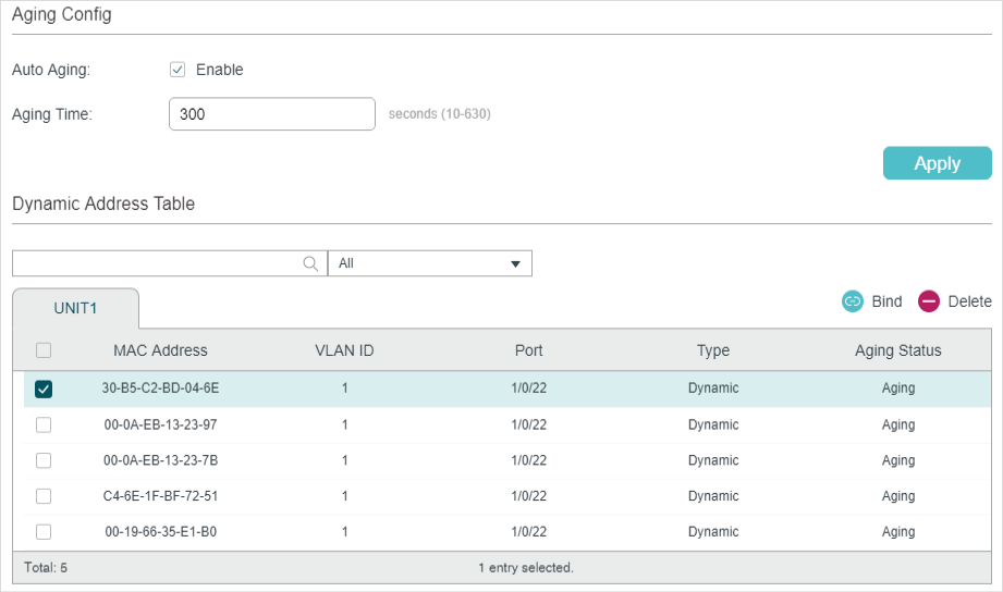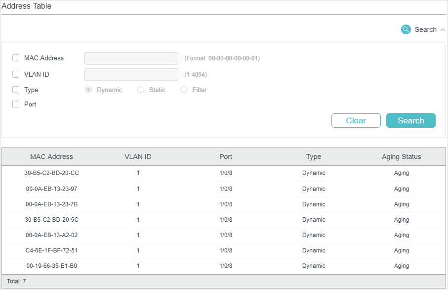 Dynamic addresses are addresses learned by the switch automatically, and the switch regularly ages out those that are not in use. That is, the switch removes the MAC address entries related to a network device if no packet is received from the device within the aging time. And you can specify the aging time if needed.