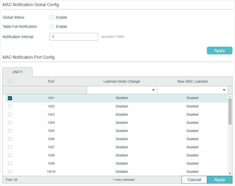 Note: T1500/T1600G series switches do not support MAC Notification or MAC VLAN Security. |