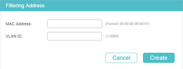 Note: •In the same VLAN, once an address is configured as a filtering address, it cannot be set as a static address, and vice versa. •Multicast or broadcast addresses cannot be set as filtering addresses. |