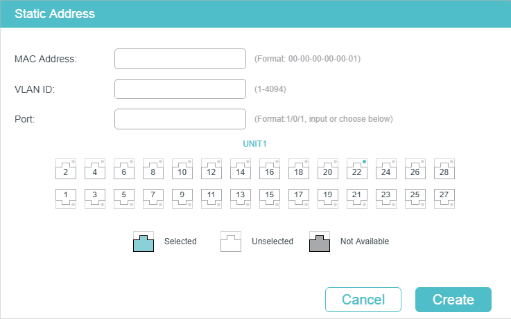 Note: •In the same VLAN, once an address is configured as a static address, it cannot be set as a filtering address, and vice versa. •Multicast or broadcast addresses cannot be set as static addresses. •Ports in LAGs (Link Aggregation Group) are not supported for static address configuration. |