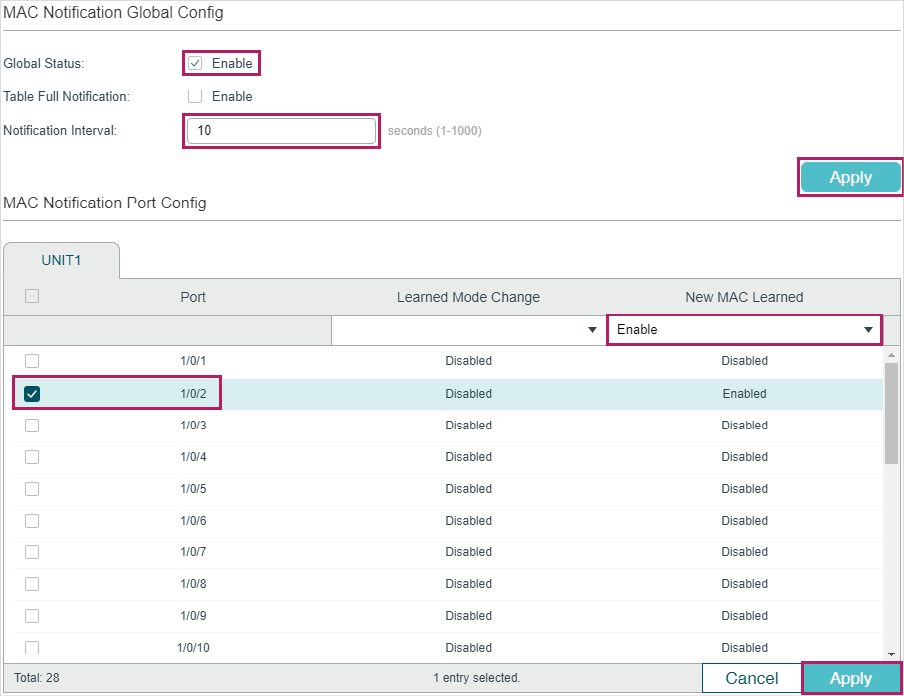Enable New MAC Learned, and when the specified port learns a new MAC address, a notification will be generated and sent to the management host. |