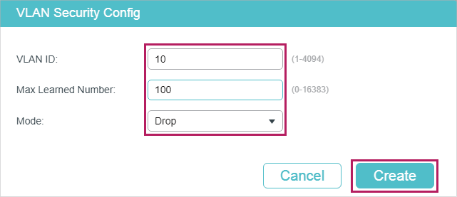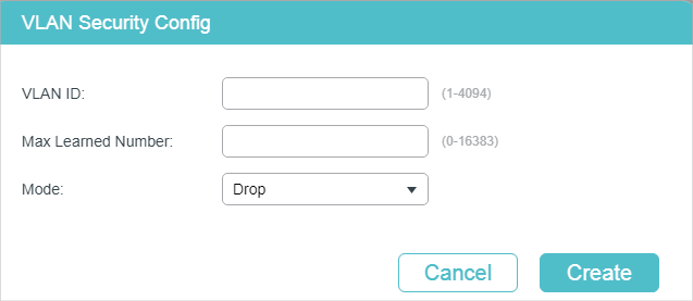 You can configure VLAN Security to limit the number of MAC addresses that can be learned in specified VLANs. The switch will not learn addresses when the number of learned addresses has reached the limit, preventing the address table from being used up by broadcasting packets of MAC address attacks.