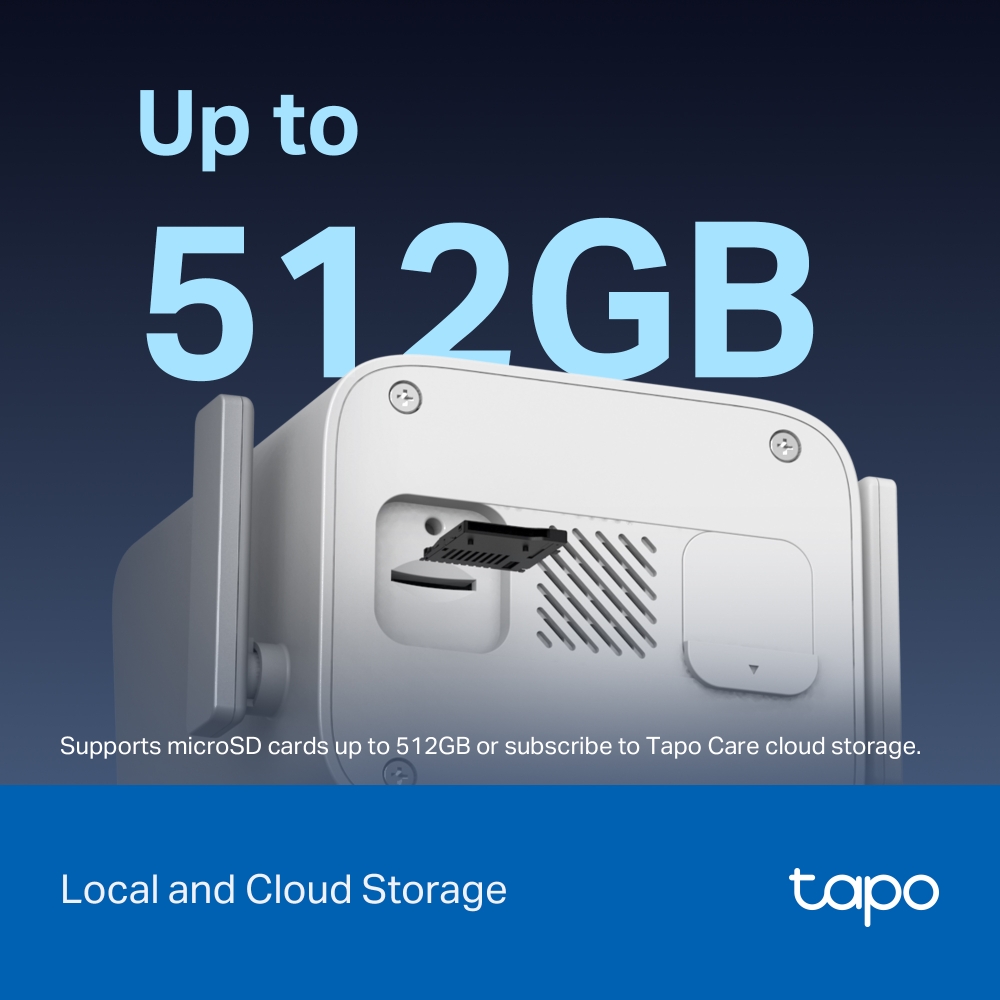 - Secure Local or Cloud Storage - Save footage continuously on up to a 512 GB microSD card (not included) or subscribe to Tapo Care for cloud storage which saves 30-day video.