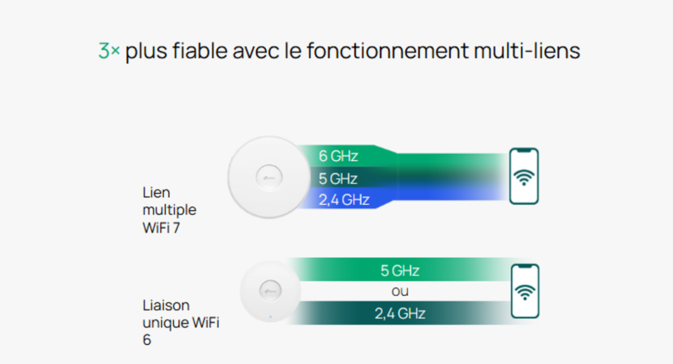 Les appareils WiFi 6 s'appuient principalement sur une seule liaison pour la transmission des données. En revanche, le WiFi 7 introduit le Multi-Link Operation (MLO), qui permet aux appareils d'utiliser plusieurs liaisons simultanément, obtenant ainsi un débit plus élevé, une latence plus faible et une fiabilité améliorée.