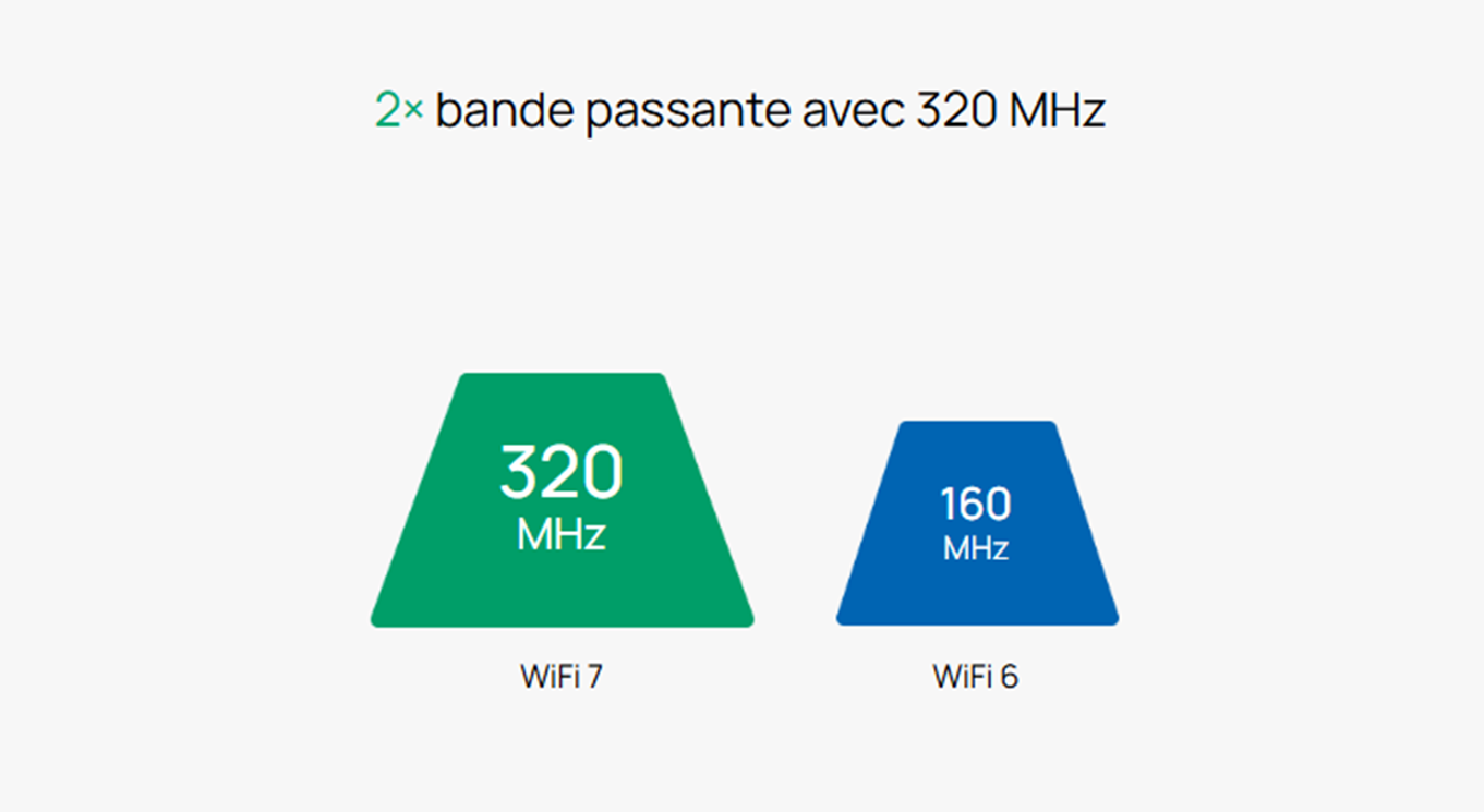Avec des canaux ultra-larges de 320 MHz, le WiFi 7 double la bande passante des 160 MHz du WiFi 6 et le nombre de sous-porteuses, offrant des taux de transfert de données considérablement plus élevés.