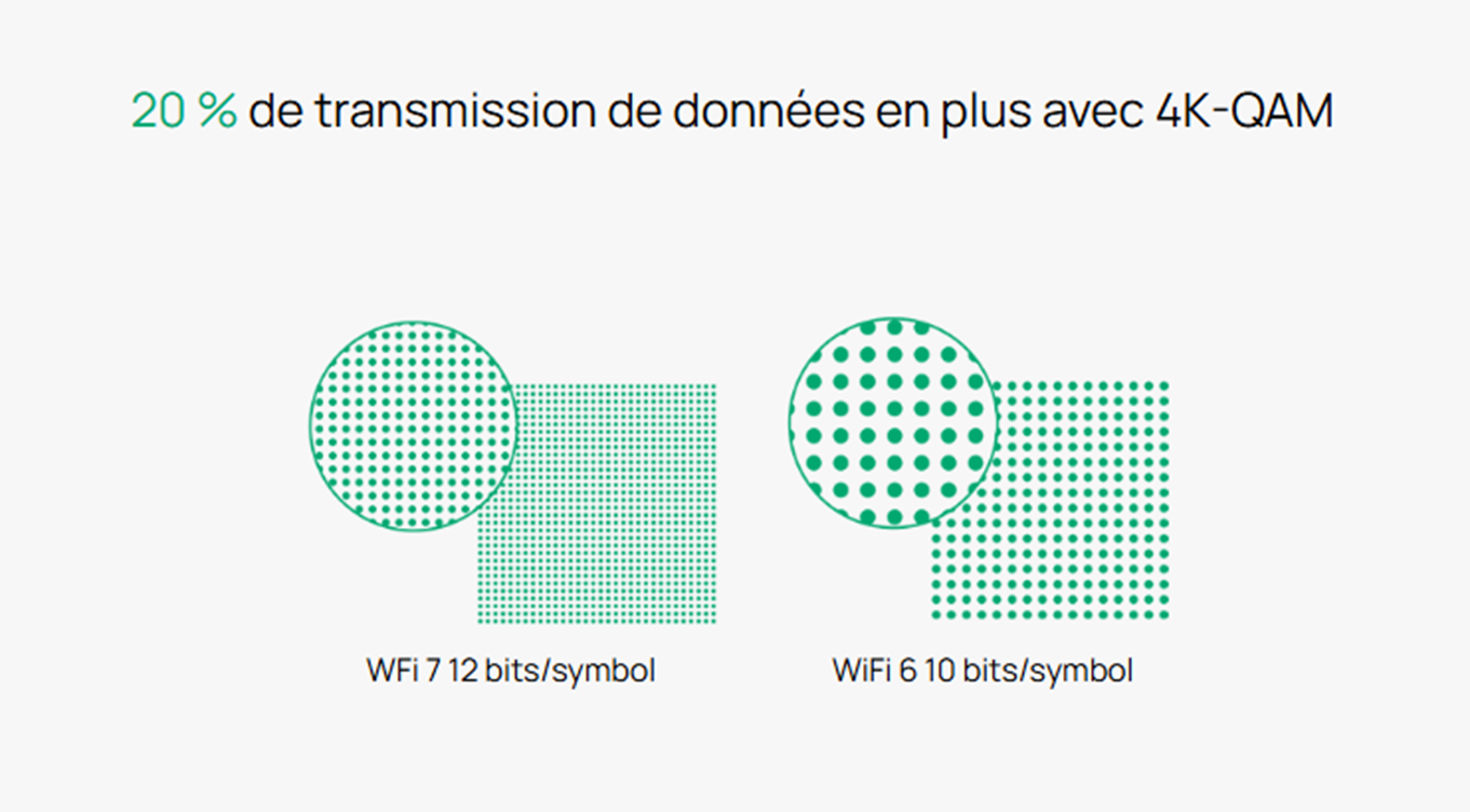 La technologie 4096-QAM permet à chaque symbole de transporter 12 bits au lieu de 10, ce qui augmente les taux de transmission théoriques de 20 % par rapport à la technologie 1024-QAM du WiFi 6. Ce taux de transmission plus élevé augmente le débit de données, offrant des vitesses améliorées et une fiabilité du réseau améliorée.