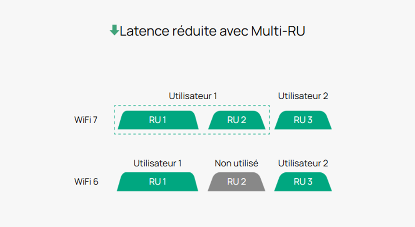 Le WiFi 6 limite chaque utilisateur à une seule unité de ressource (RU), ce qui limite la flexibilité du spectre. Le WiFi 7 surmonte cette limitation en permettant l'attribution de plusieurs RU à un seul utilisateur et en permettant l'agrégation de RU, améliorant ainsi le débit de données et l'efficacité spectrale.