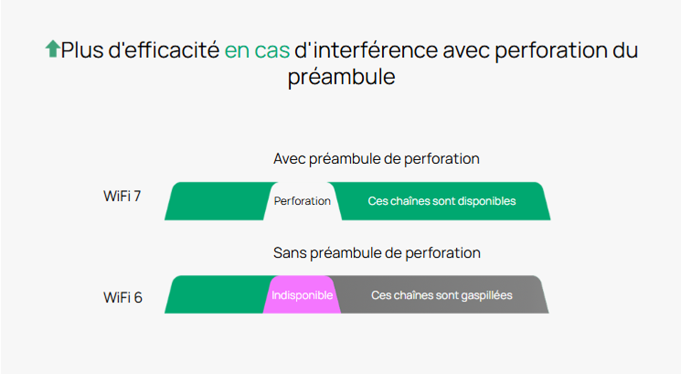 La perforation du préambule identifie et exclut les sous-porteuses affectées par les interférences, réduisant ainsi le gaspillage spectral et augmentant l'efficacité dans des conditions sans fil difficiles.