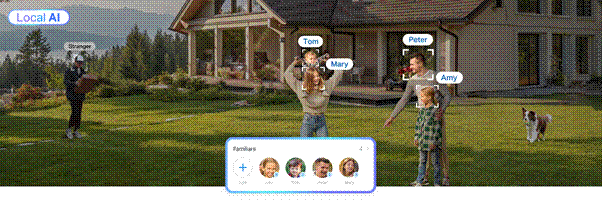 La caméra met à profit ce niveau de précision en intégrant une intelligence artificielle locale capable de reconnaître et suivre les personnes, animaux et véhicules. De plus, la fonction de reconnaissance faciale (disponible gratuitement) distingue les membres de la famille, les amis et les inconnus et adapte au besoin sa surveillance. Il est ainsi possible de limiter les fausses alertes pour envoyer uniquement des notifications pertinentes. Les utilisateurs peuvent consulter des rapports détaillés sur la répartition des visages et événements, suivre l’activité d’une personne ou d’un animal spécifique, et accéder rapidement aux moments clés grâce à l’affichage en direct et aux enregistrements horodatés, tout en conservant un contrôle total sur leurs données. L’ensemble des fonctions de reconnaissance est entièrement traité localement offrant une gestion sécurisée et confidentielle.