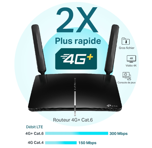 - Modem/routeur 4G+ - Cette box prend en charge la 4G+ Cat. 6 (LTE Advanced) pour augmenter le débit de votre connexion Internet jusqu'à 300 Mbps*