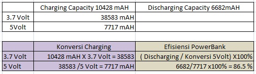 Dengan efisiensi sebesar 86.5% maka powerbank ini mendekati real terhadap siklus pemakaian discharging ke gadget tetapi kembali ke alat USB Tester tersebut karena kesalahan error 1- 2% bisa saja terjadi dari penggunaan USB tester.