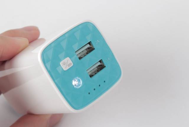 selain mempunyai 1 Port MicroUSB dan 2 Port USB TPLink PB10400 mempunyai indikator 4 LED serta tombol untuk indikator battery sekaligus untuk mengaktifkan senter dengan LED.