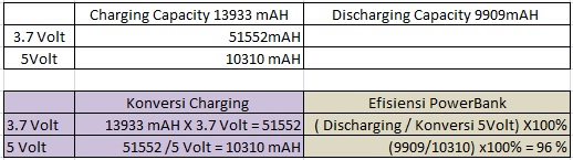 Dengan tabel tersebut diketahui hasil akhir Powerbank TPLink PB15600 mempunyai efisiensi power 96% yang real bisa digunakan untuk mencharging sebuah perangkat dengan power yang lost sekitar 4% saja dalam hal ini. Jumlah prosentasi efisiensi power tersebut tentu sangat baik mengingat mendekati power total dari keseluruhan perangkat yakni 100%.