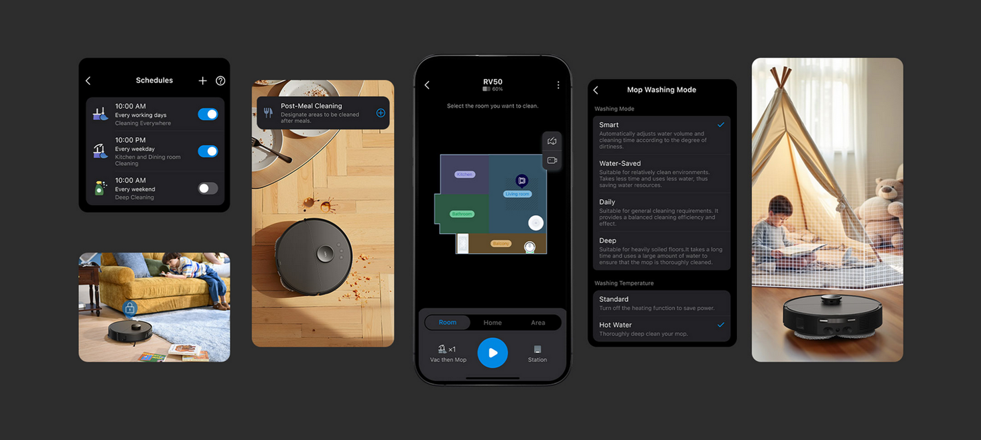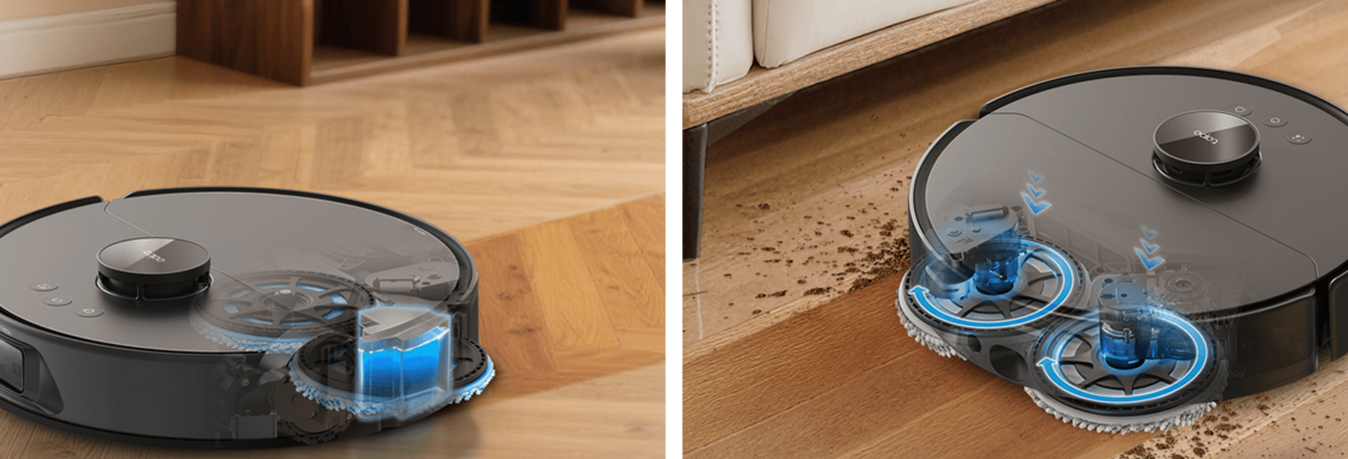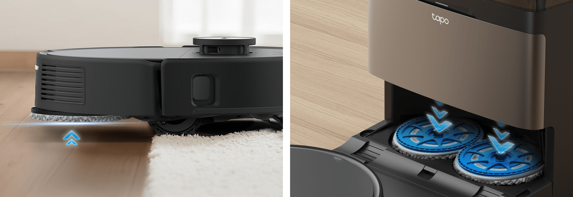 Il cuore tecnologico di Tapo RV50 Pro Omni è il suo straordinario sistema di aspirazione da 15.000 Pa con 5 livelli di potenza, capace di rimuovere lo sporco più ostinato e i detriti annidati nei tappeti con estrema facilità. Per ridurre al minimo ogni intervento manuale, il robot è dotato di spazzole anti-groviglio che tagliano automaticamente peli e capelli quando il dispositivo ritorna alla base. Il sistema di lavaggio DeepEdge Adaptive estende i panni removibili verso l’esterno, garantendo una pulizia precisa lungo bordi e angoli, aree difficili da raggiungere per i dispositivi tradizionali. Un serbatoio integrato da 95 ml mantiene il mocio uniformemente umido, così ogni passata lascia i pavimenti lucidi e senza aloni. Inoltre, grazie alla tecnologia CarpetMaster, il robot rileva i tappeti e provvede alla rimozione automatica dei panni o al loro sollevamento fino a 12 mm per evitare di bagnarli durante l'aspirazione. L’accurata strategia di pulizia e la navigazione negli ambienti di casa sono assicurate dal sistema Dual-Laser Precision Avoidance, che, grazie ai laser frontali e laterali in grado di rilevare ostacoli in tempo reale, muove Tapo RV50 Pro Omni con precisione, riducendo urti, proteggendo i mobili e mantenendo un percorso fluido ed efficiente.