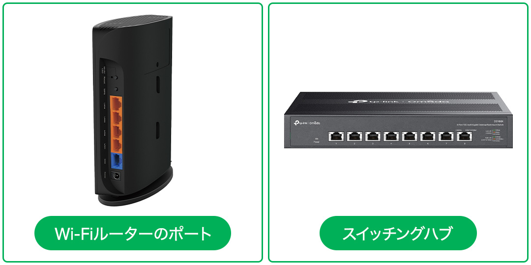 - 数:接続する端末がPC 1台など少ない場合は問題ないですが、多くの端末を有線(LAN)で接続したい場合はポート数の多いモデルを採用しましょう。どうしてもポートが足りないときは、スイッチングハブで接続数を増やすこともできます。