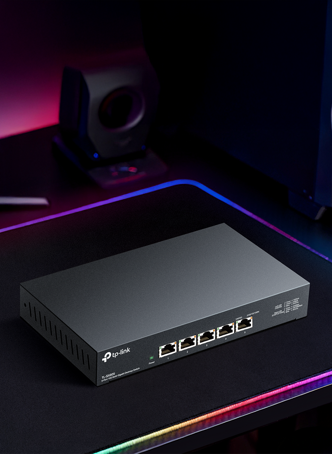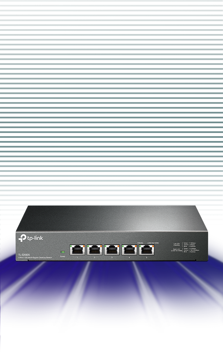 「TL-SX605」は、10Gポートを5つ搭載したアンマネージスイッチです。最大100Gbpsのスイッチング容量を備え、5スピード(100Mbps/1G/2.5G/5G/10G)対応のAuto-Negotiation機能でリンク速度を自動検知。10G NAS・10Gサーバー・ワークステーション・ゲーミングPC・2.5G/5G/10G Wi-Fi 7 AP・8K動画・デスクトップ等、あらゆるデバイスで最適なパフォーマンスを発揮します。